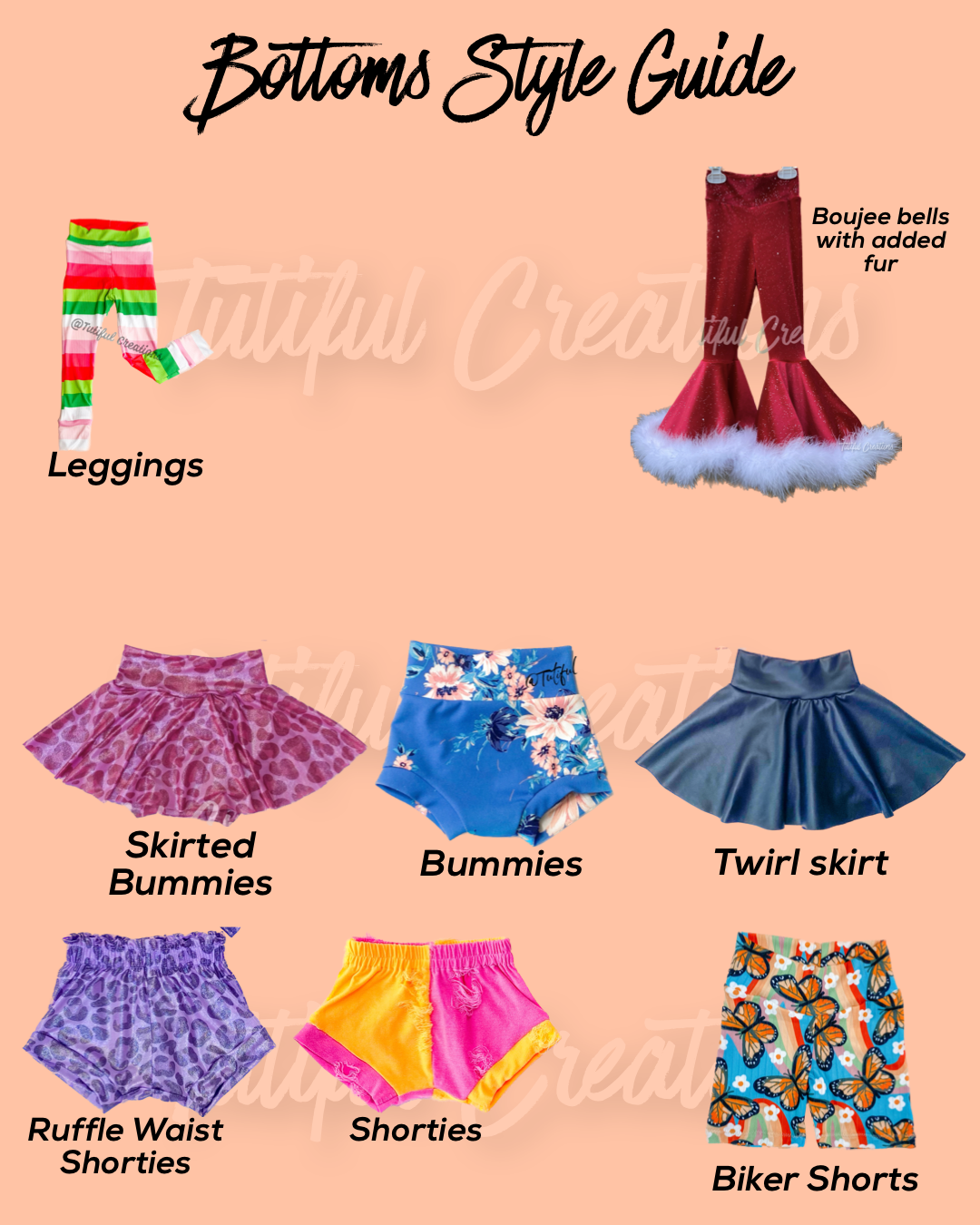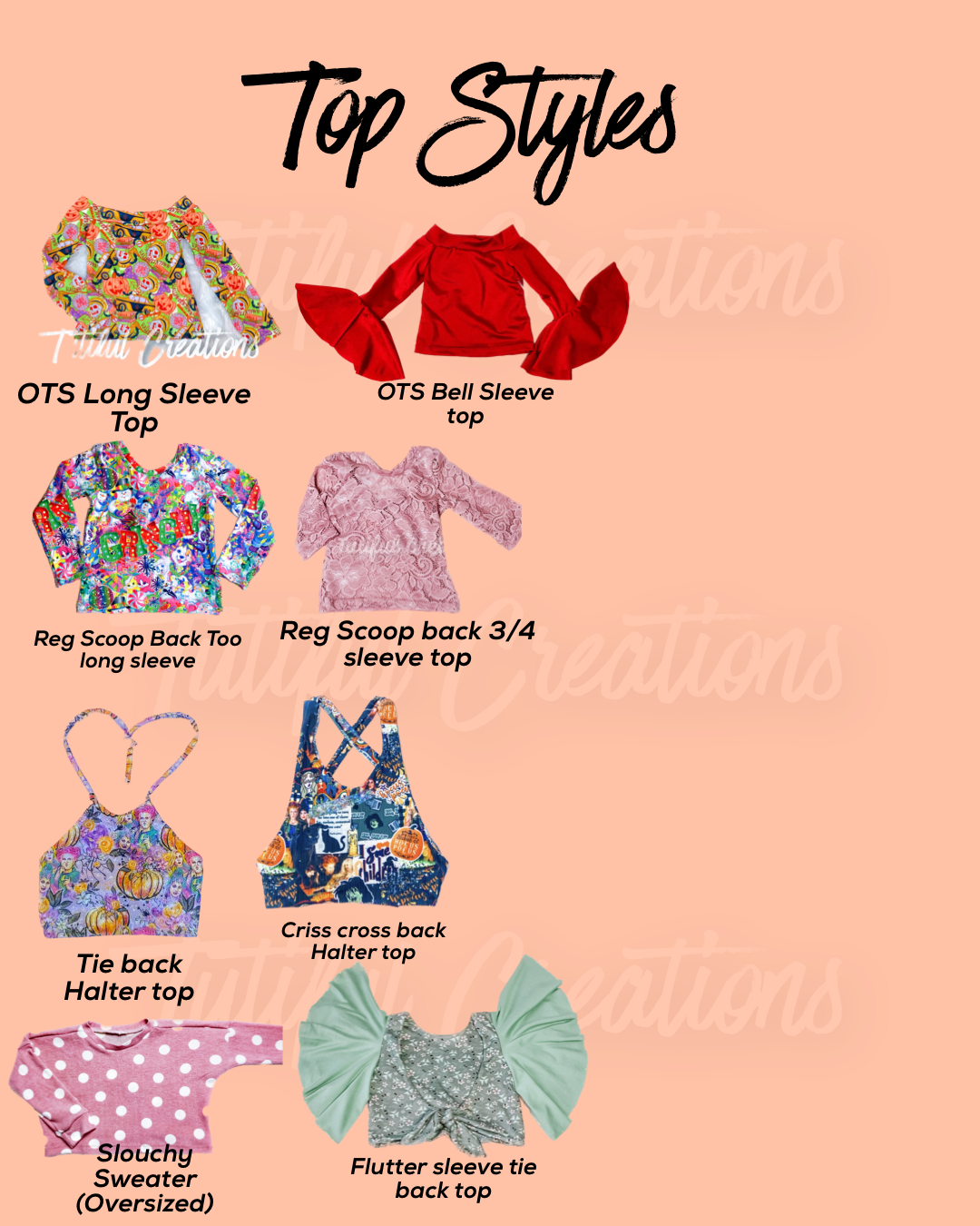 All items below fit TTS. I only recommend to size up on our Bow Back tops and the Reg. scoop back, OTS, One Shoulder Leotards/Tops sizes NB-12/18, 24 months and up for TTS. (Flutter sleeve will be an add on option)